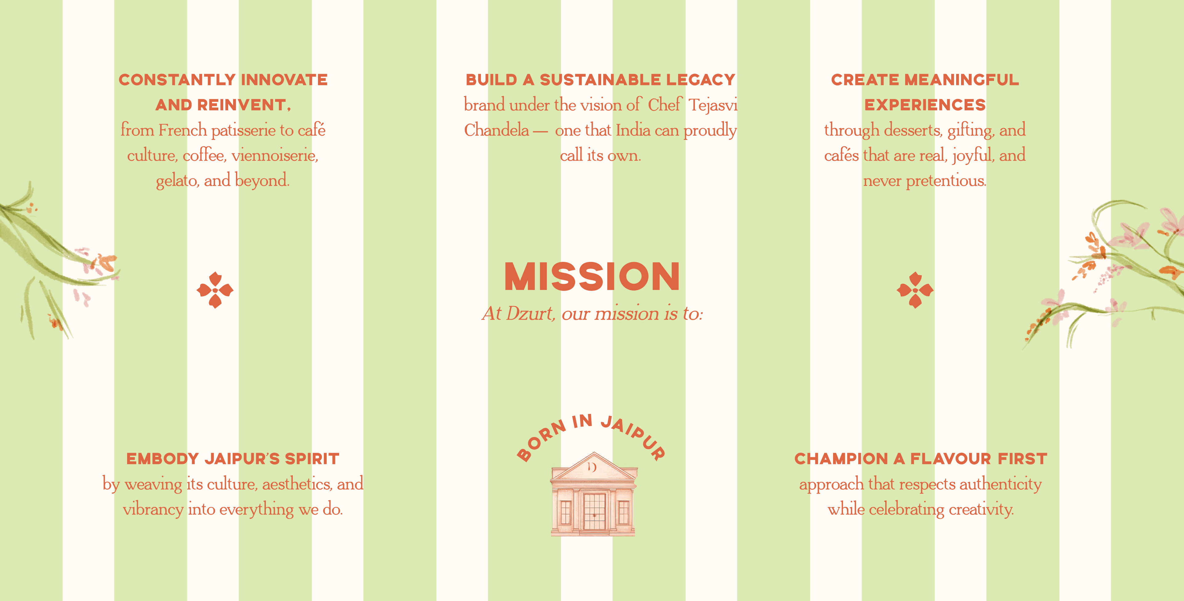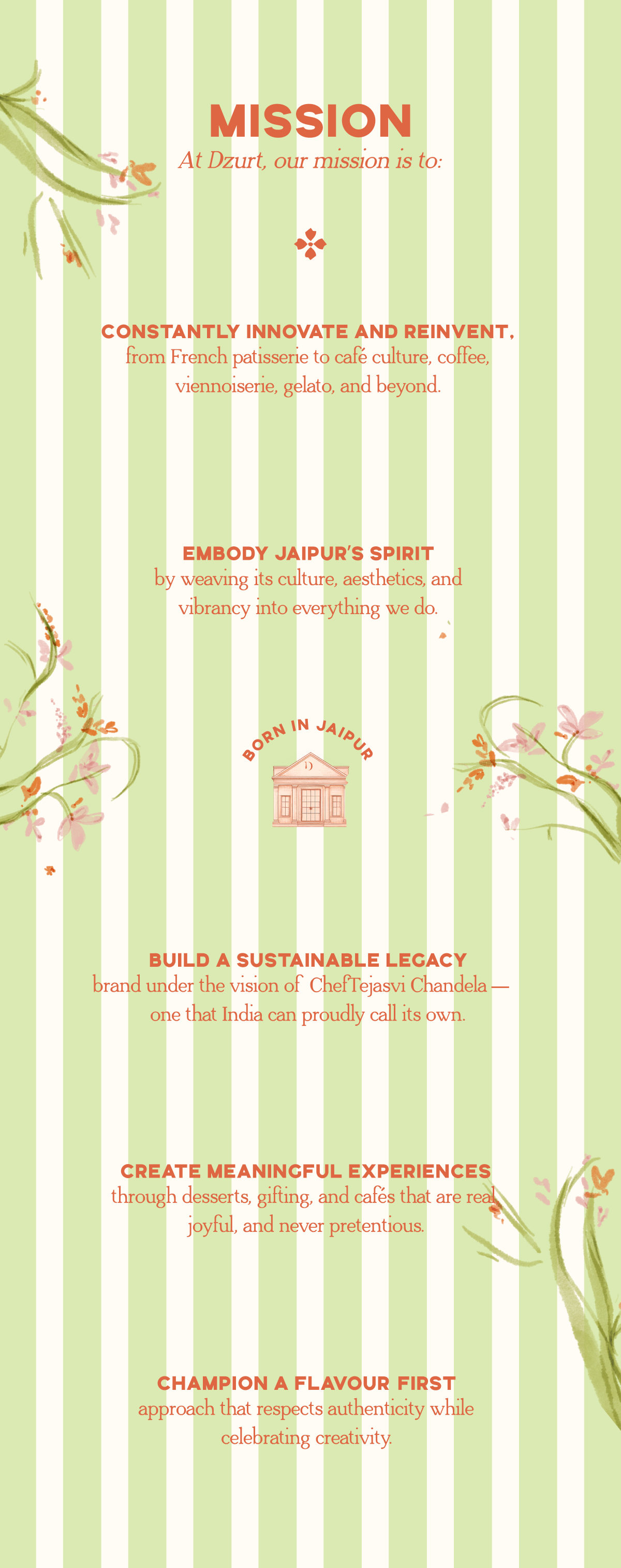 To redefine India's patisserie culture by creating a legacy brand born in Jaipur — one that seamlessly blends Indian heritage with modern craftsmanship, offering indulgences that are flavour-first, design-forward, and timeless in experience.