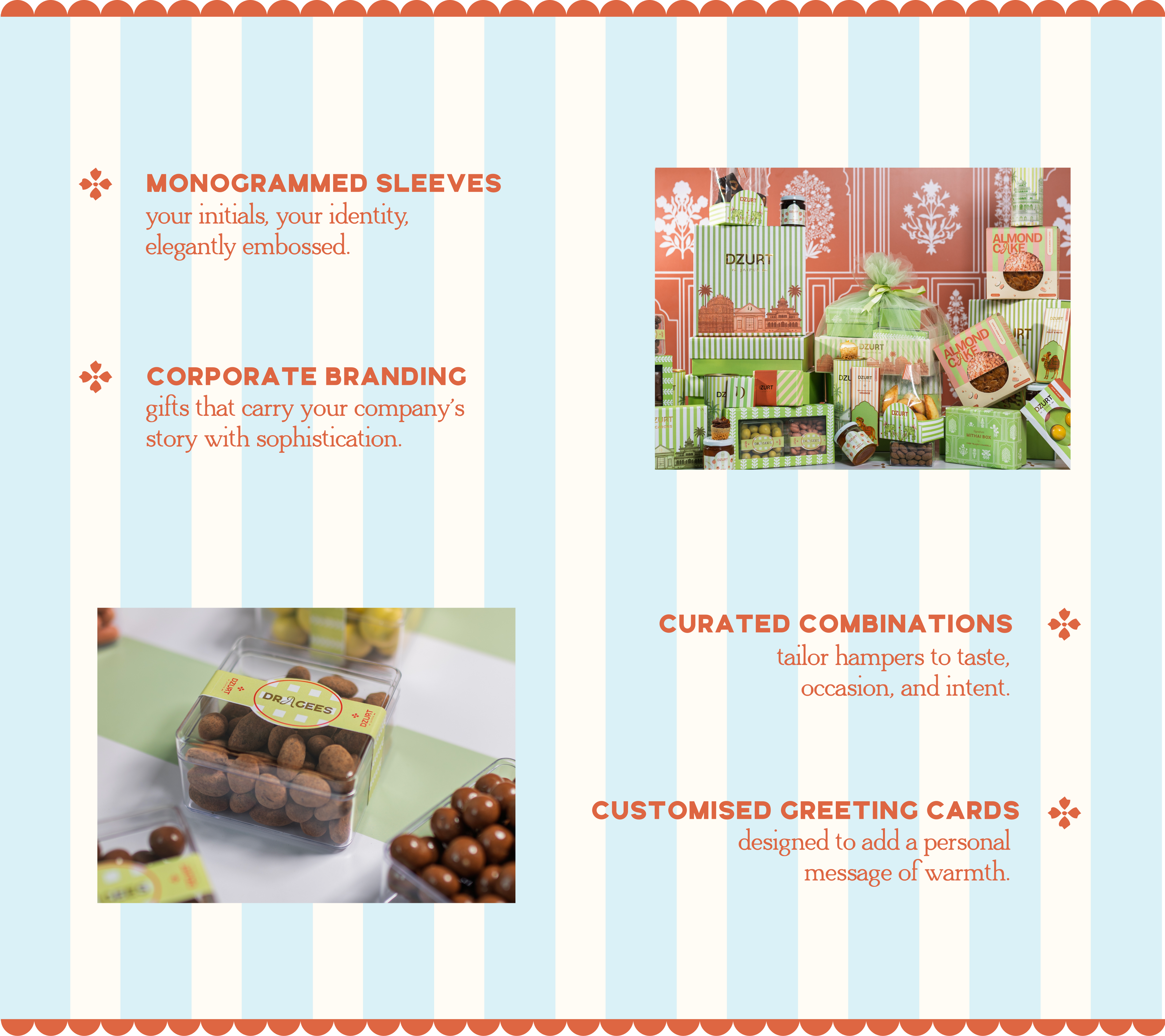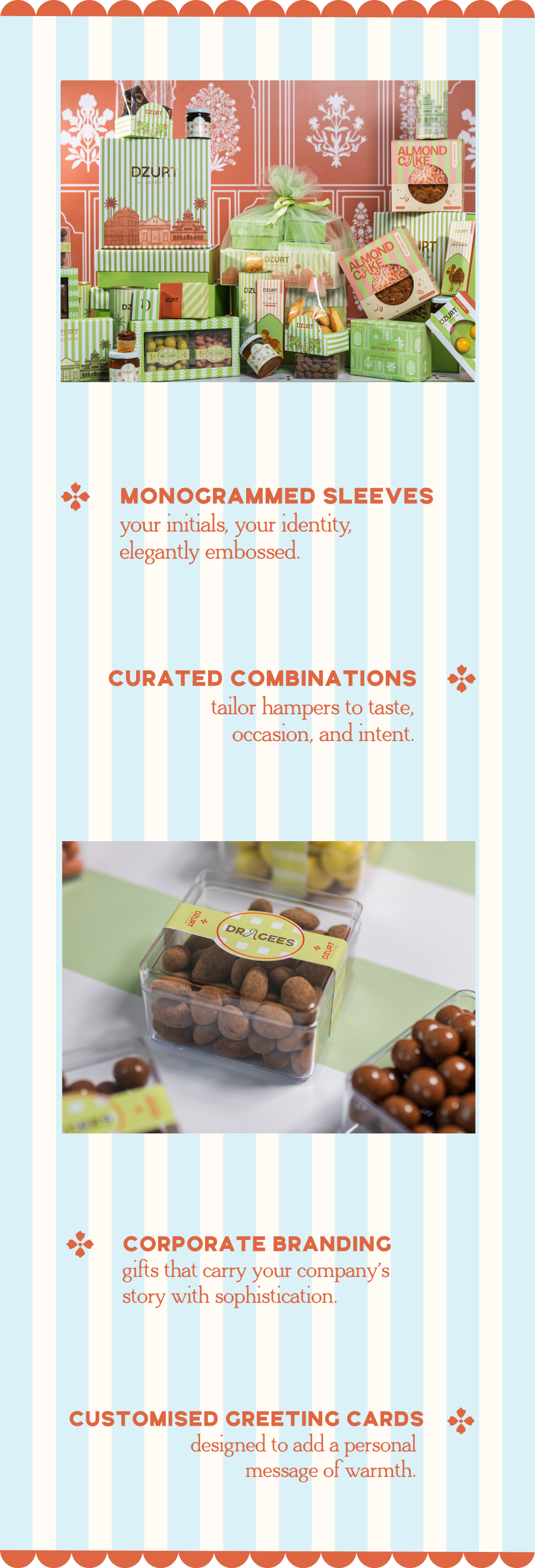 Every celebration carries its own Story, and your Gifts at Dzurt should reflect that. We offer, for select orders*, the option of Bespoke touches that transform every box into a reflection of you.
