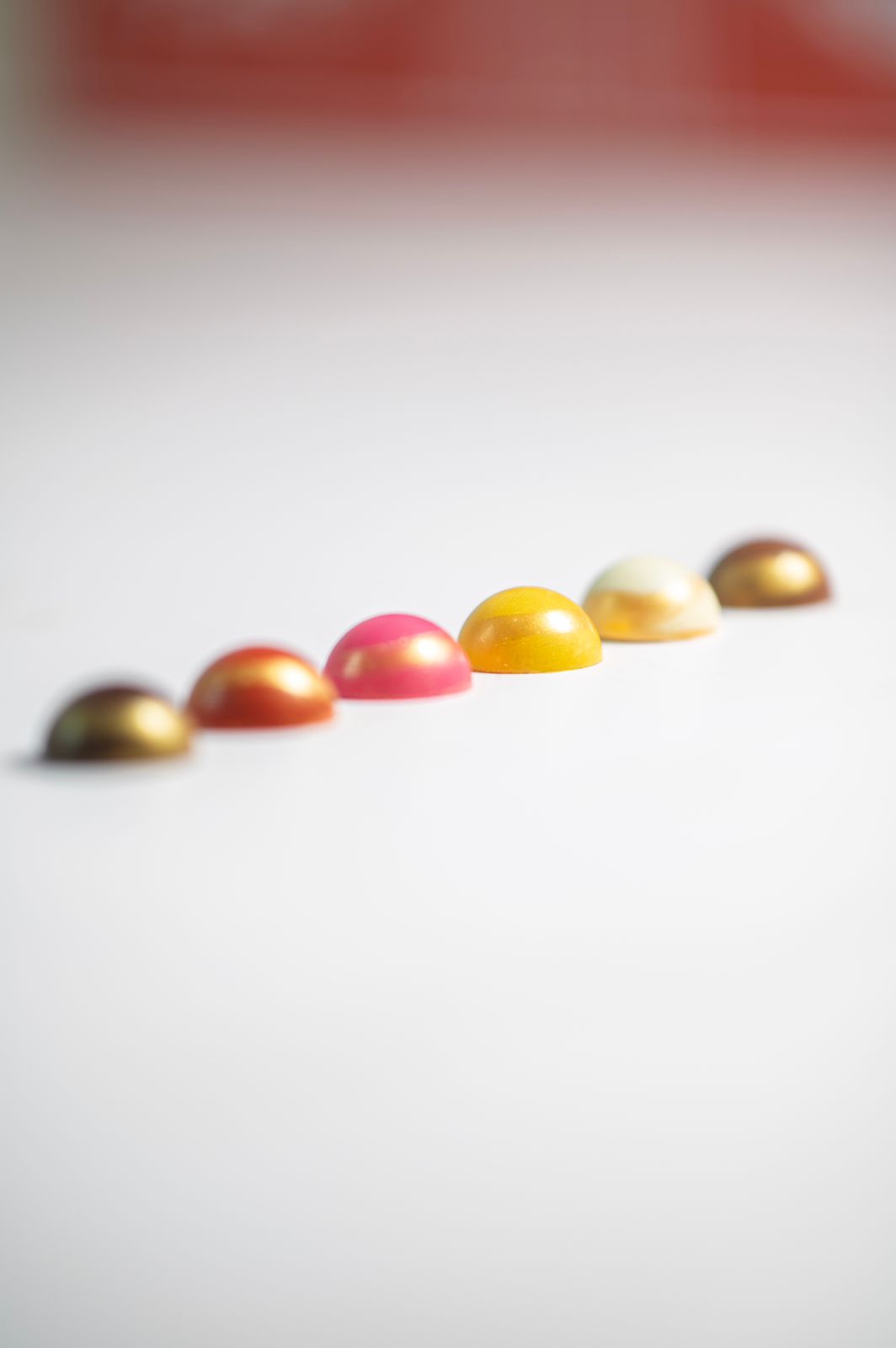 1. Orange Bon Bons- Orange gel, Dark Chocolate, Orange Juice, Orange Zest, Sugar, Cocoa Butter, Glucose, Pectin, Cream
